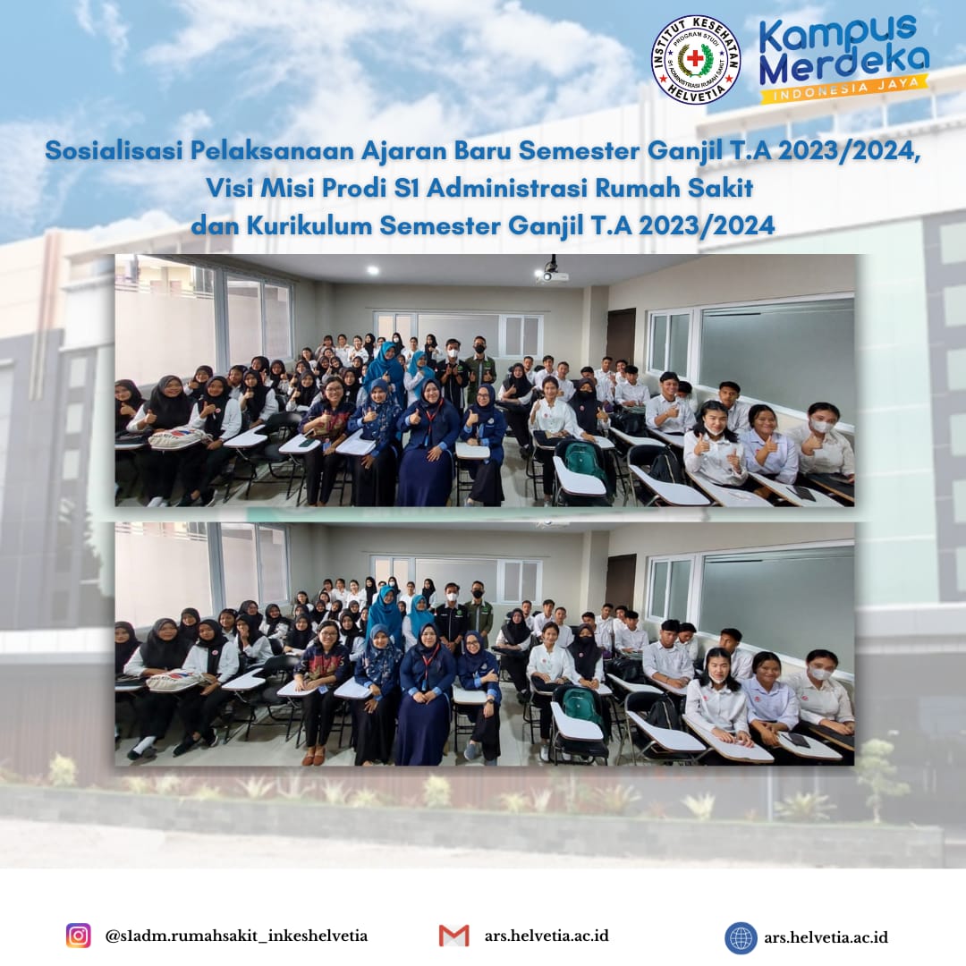 Kegiatan Sosialisasi Pelaksanaan Tahun Ajaran Baru Semester Ganjil TA 2023/2024 mahasiswa Prodi S1 Administrasi Rumah Sakit yang dilaksanakan di Institut Kesehatan Helvetia Medan pada tanggal 18 September 2023 .